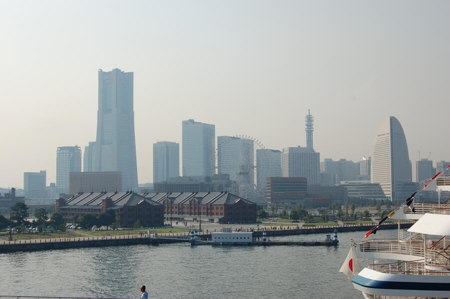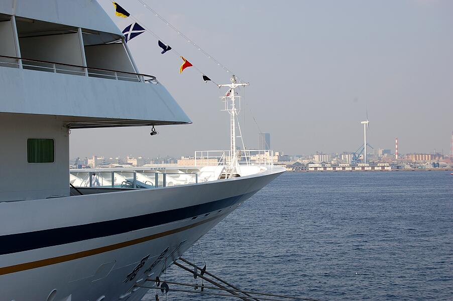 船尾の向こうにはみなとみらい地区が見えます。
